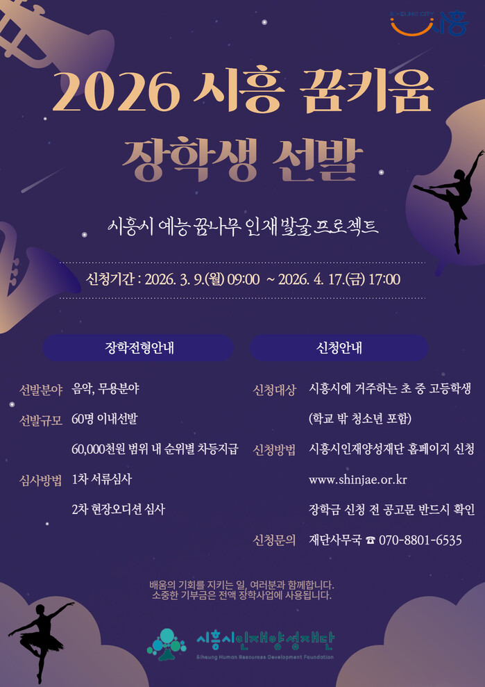 재단 관계자는 “꿈키움 장학생 사업은 경제적 지원을 넘어, 학생 개개인의 가능성과 미래를 응원하는 제도”라며 “음악ㆍ무용 분야의 유망한 인재들이 시흥에서 꿈을 키우고 성장할 수 있도록 지속적인 지원을 이어가겠다”라고 말했다.