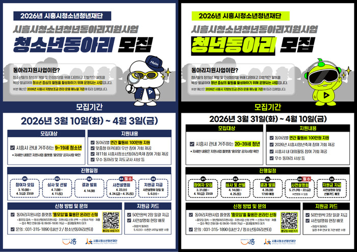 [시흥=송윤근 기자] 경기 시흥시(시장 임병택)와 시흥시청소년청년재단은 지역 청소년과 청년의 자율적인 동아리 활동을 지원하고 건강한 문화 형성을 위해 ‘2026년 시흥시 청소년ㆍ청년 동아리 지원사업’에 참여할 동아리 670개를 모집한다고 밝혔다.