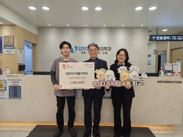 강한마디재활의학과의원은 장곡동에 있는 재활의학 전문 의료기관으로, 지역 주민의 건강 회복과 삶의 질 향상을 위해 꾸준히 노력해 왔으며, 지난해 지역화폐 시루 200만 원을 기탁한 데 이어 올해도 후원을 이어가며 사회공헌 활동에도 적극 참여하고 있다.