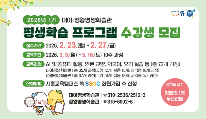 수강 신청은 2월 23일부터 27일까지 시흥교육캠퍼스 쏙(SSOC) 누리집에서 회원가입 후 가능하다. 이번 모집부터는 공정한 참여 기회 제공을 위해 기존 추첨 방식에서 온라인 선착순 신청으로 변경됐다. 교양ㆍ자격증 과정은 2월 23일 오전 9시부터, 실용 과정은 2월 24일 오전 9시부터 신청이 진행된다.