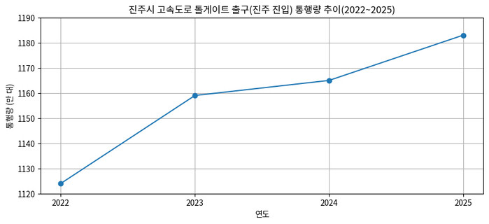 또한 고속도로 통행량에서도 증가 흐름이 확인됐다. 한국도로공사 자료에 따르면 진주·문산(동진주)·서진주·진성·지수 등 진주시 5개 톨게이트 출구(진주로 들어오는 차량) 통행량은 2022년 1124만 대에서 2025년 1183만 대로 약 59만 대(약 5.2%) 증가한 것으로 나타났다. 연도별로는 2022년 1124만 대, 2023년 1159만 대, 2024년 1165만 대, 2025년 1183만 대로 집계됐다.