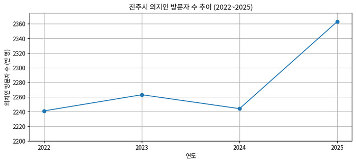 한국관광공사 관광데이터랩 자료에 따르면 진주시 외지인 방문자 수는 2022년 2241만 명에서 2025년 2363만 명으로 약 122만 명(약 5.4%) 증가한 것으로 나타났다. 연도별로는 2022년 2241만 명, 2023년 2263만 명, 2024년 2244만 명, 2025년 2363만 명으로 집계됐다.
