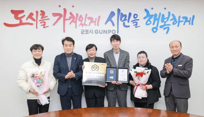| ▲ 하은호 군포시장(왼쪽 두번째)이 군포시 및 산본래미안하이어스 아파트가 ‘2025년 경기도 착한아파트’로 선정되어 표창을 수상 관계자들과 기념 촬영을 하고 있다 /사진제공=군포시 |