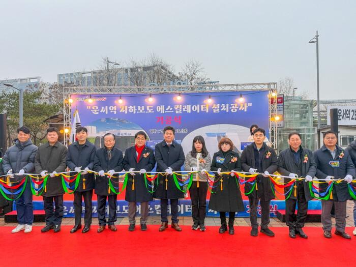 | 운서역 지하보도 에스컬레이터 설치 공사 기공식 참석자들이 기념테이프 커팅을 하고 있다. [사진=중구의회] |