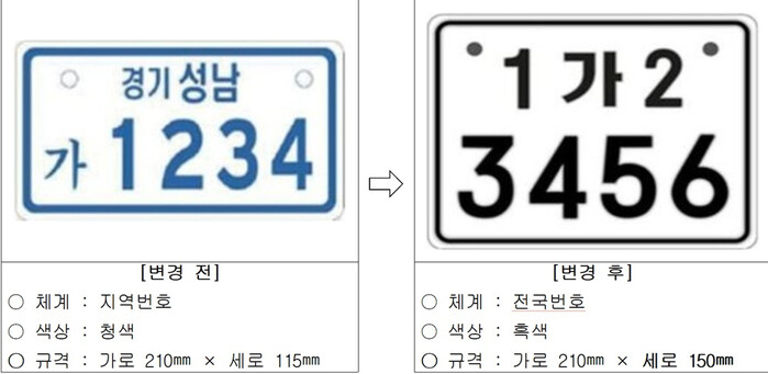이에 따라 기존 지역번호 체계는 전국번호 체계로 전환하고, 이륜자동차 번호판 규격은 기존 21㎝×11.5㎝(청색)에서 21㎝×15㎝(흑색)로 확대한다. 세로 길이가 3.5㎝ 늘어나면서 원거리에서도 번호 식별이 보다 쉬워질 것으로 전망된다.