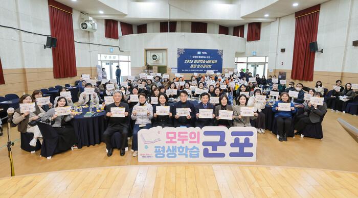 | ▲ ‘2025년 평생학습 네트워크 통합 성과공유회’를 진행한 뒤 참석자들이 기념 촬영을 하고 있다 /사진제공=군포시 |