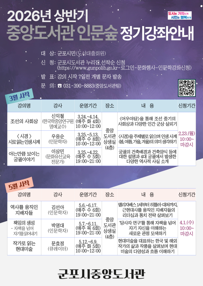| ▲ ‘중앙도서관 인문숲’ 상반기 강좌 안내 포스터 /자료제공=군포시 |