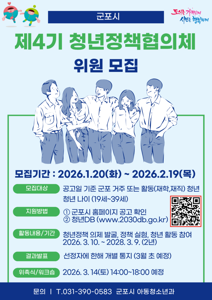 [군포=송윤근 기자] 경기 군포시(시장 하은호)는 제4기 군포시 청년정책협의체 위원을 오는 2월 19일(목)까지 모집한다고 밝혔다.