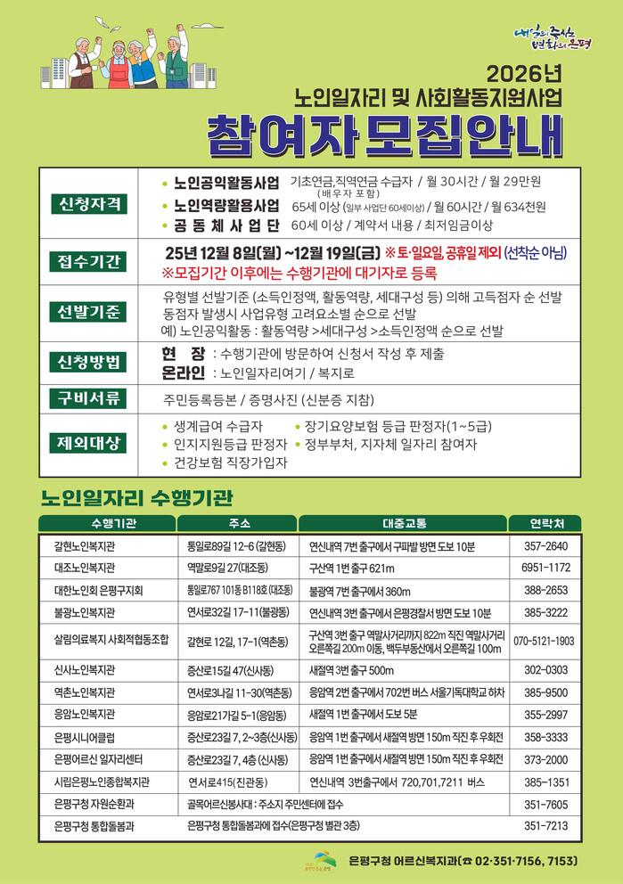 선발 결과는 2026년 1월 6일 개별 안내될 예정이며, 기타 자세한 사항은 각 수행기관 또는 은평구청 어르신복지과로 문의하면 된다.