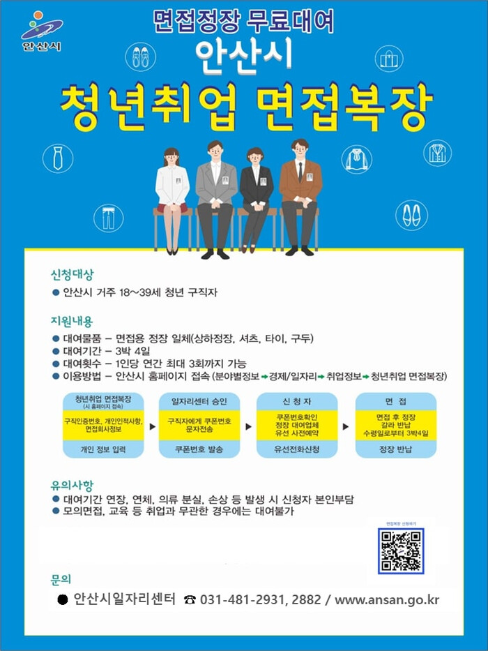 서비스 신청은 안산시청 누리집 ‘분야별 정보 → 경제/일자리 → 일자리(취업)정보 → 청년취업 면접복장 무료대여’에서 할 수 있으며, 서비스에 대한 자세한 사항은 안산시일자리센터로 문의하면 안내받을 수 있다.