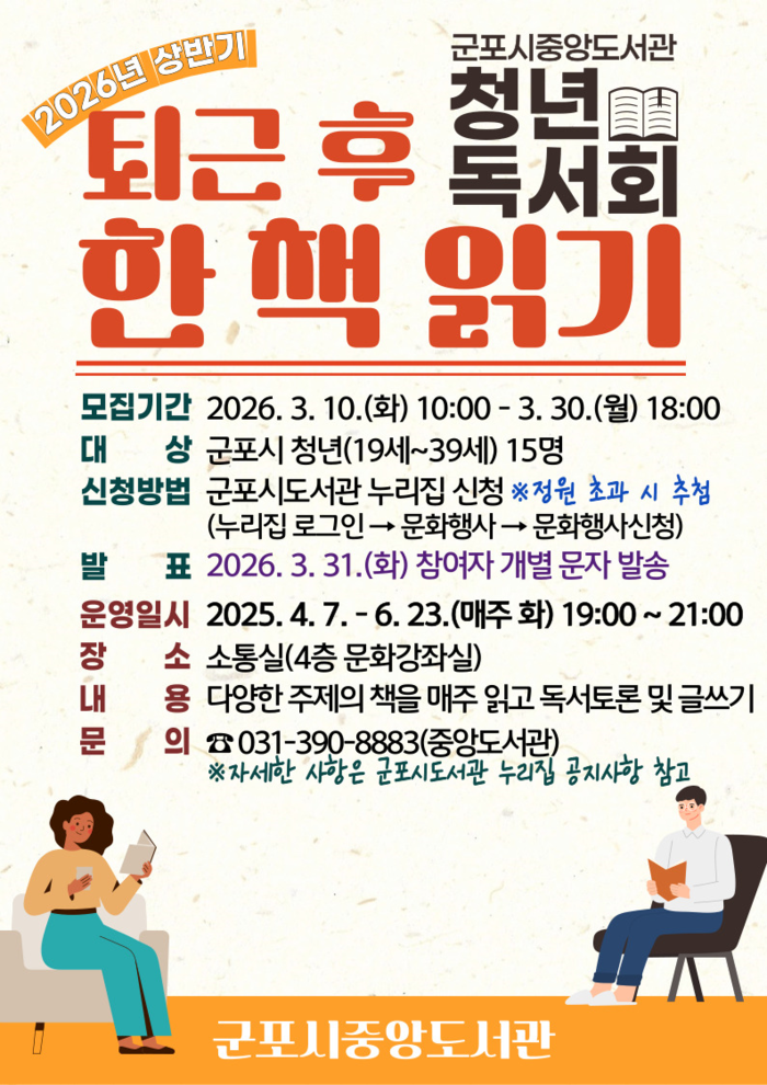 | ▲ 2026년 4월부터 상반기 청년독서회 「퇴근 후 한 책 읽기 : 소설을 읽다, 사람을 읽다」 운영 안내문 /자료제공=군포시 |