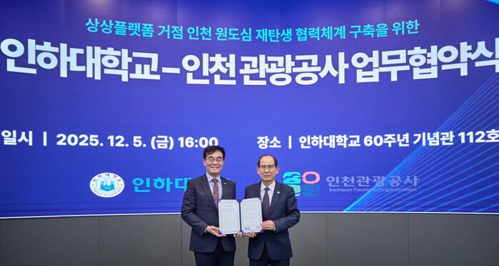 | 조명우 인하대 총장(왼쪽)과 유지상 인천관광공사 사장이 업무협약을 체결한 후 기념 촬영을 하고 있다. (사진=인하대) |