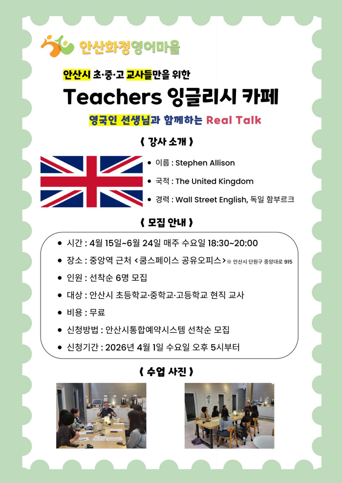 ‘Teachers 잉글리시 카페’는 영어 회화에 관심이 있는 안산시 초·중·고등학교 선생님들을 대상으로 영어 말하기 환경을 조성하고, 학습 네트워크 형성을 지원하는 프로그램이다. 지난해 하반기 운영 결과 높은 만족도를 보이며 올해도 진행하게 됐다.