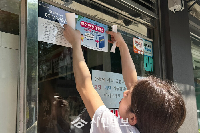 | ▲ 아이 지키는 ‘안심 울타리’ 아이 안전 대피소 인증 부착 자료사진 / 광주광역시 서구 제공 |