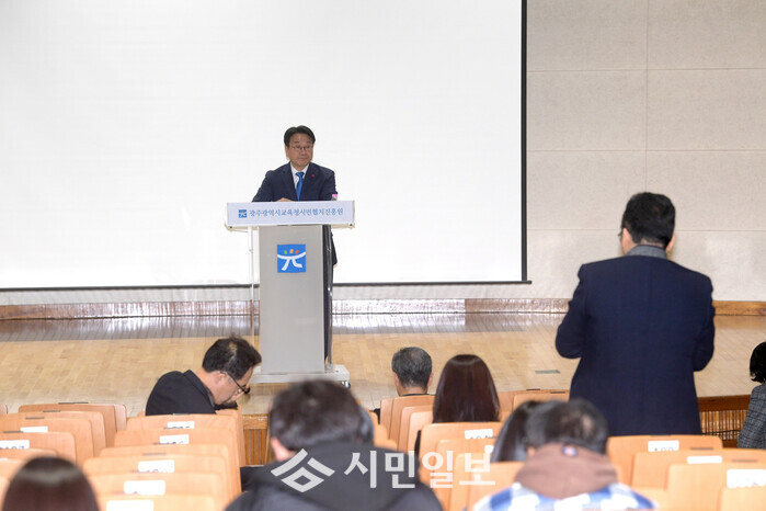 [광주=정찬남 기자] 강기정 광주광역시장이 지난 15일 광주시교육청시민협치진흥원 대강당에서 광주전남 행정통합 추진에 따른 '광주 교사·교직원 노동조합 대상 간담회'에 참석해 행정통합 추진배경과 필요성, 향후 방향 등에 대해 설명하고 있다. /광주광역시 제공