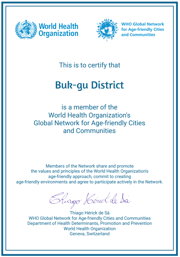 문인 북구청장은 “우리 구가 고령친화도시로 다시 인증받은 것은 어르신들이 지역사회에서 행복한 일상을 누릴 수 있도록 지속적으로 노력해 온 결과”라며 “고령친화도시 조성 사업을 통해 사회의 버팀목인 어르신들이 건강하고 품위 있는 삶을 보낼 수 있도록 최선을 다하겠다”고 말했다.