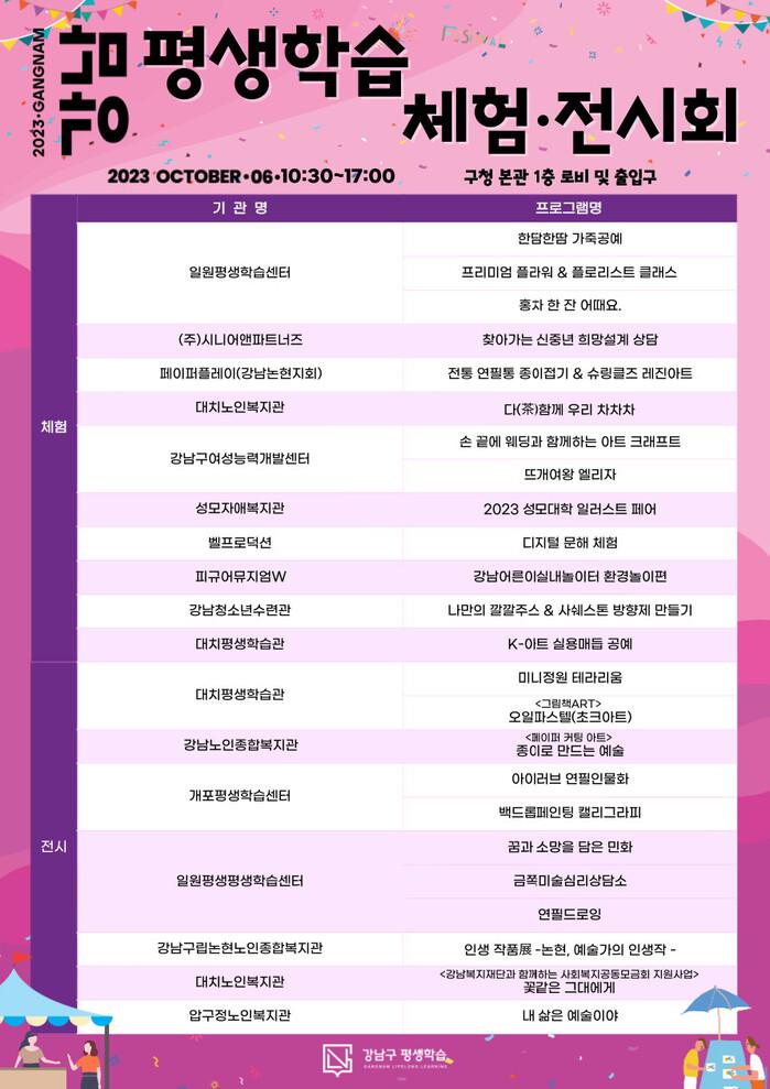 조성명 구청장은 “강남구 평생학습을 한 번에 만날 수 있는 이번 행사에서 배움에 대한 구민들의 뜨거운 열정을 느껴보길 바란다”며 “연령을 막론하고 누구나 학습자가 되는 시대에 개인의 잠재력을 발전시키고 공동체에 기여할 수 있는 다양한 평생학습 프로그램을 지원하겠다”고 밝혔다.