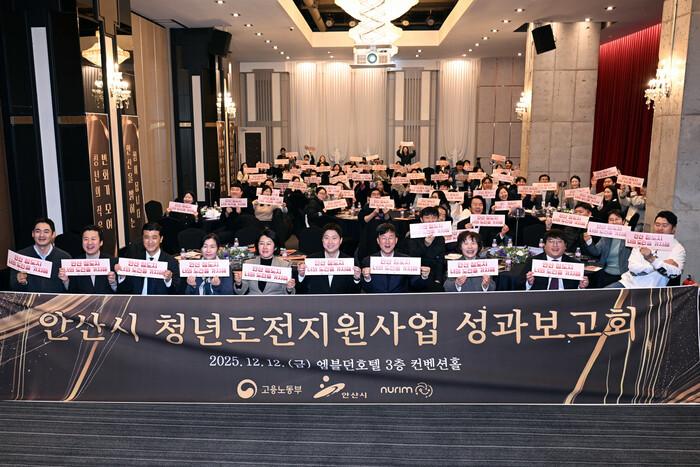 | ▲ 이민근 안산시장(앞줄 오른쪽 네번째)이 2025년 청년도전지원사업 성과 보고회 참석자들과 기념 촬영을 하고 있다 /사진제공=안산시 |