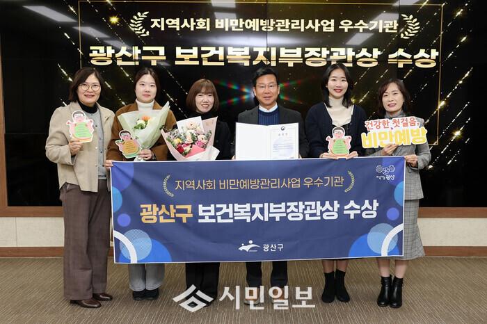 | ▲ 박병규 광주광역시 광산구청장(사진 오른 쪽부터 세 번째)이 지난 5일 광보건복지부와 한국건강증진개발원 주관 '2025년 지역사회 비만예방관리사업' 전국 펑가에서 우수기관에 선정돼 장관상을 수상 한 후 광산구보건소직원들과 기념촬영을 하고 있다. / 광산구청 제공 |