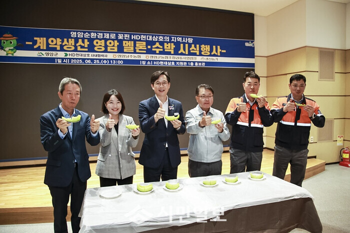 | ▲ 우승희 영암군수(왼 쪽부터 세 번째)가 지난 해 6월 25일 오후 HD현대삼호지원관 1층 홍보관에서 HD현대삼호 협력사 관계자 등과 멜론 시식회를 하고 있다. / 영암군 제공 |