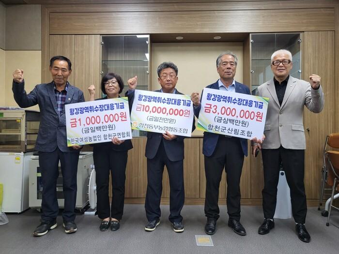 이날 합천동부농업협동조합(조합장 노태윤)에서 1000만원, 합천군산림조합(조합장 김태수)에서 300만원, 한국여성농업인 합천군연합회(회장 김춘자)에서 100만원을 기탁했다.
