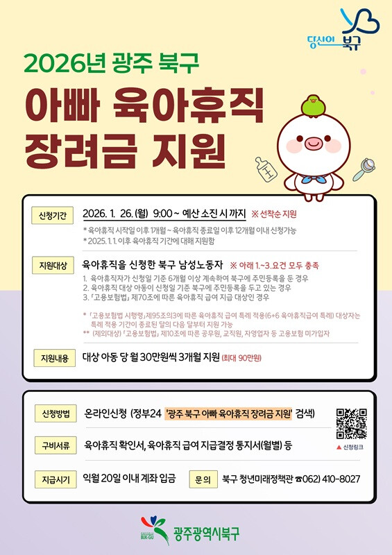 문인 북구청장은 “이번 사업이 남성 육아 참여를 높여 지역에 일과 가정이 조화로운 문화가 자리 잡기를 바란다”며 “앞으로도 양육 친화 도시를 만들기 위해 체감도 높은 사업을 적극 추진하겠다”고 말했다.