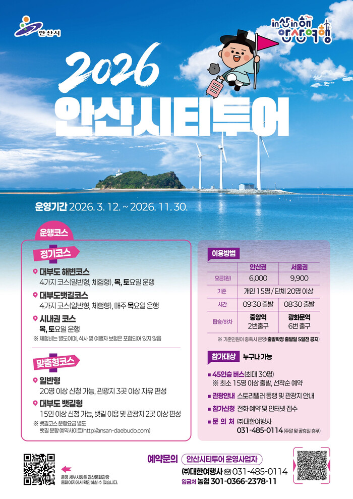 시티투어는 사전 예약제로 운영되며 대한여행사를 통해 예약할 수 있다. 자세한 코스 정보는 안산시 관광 누리집에서 확인할 수 있다.