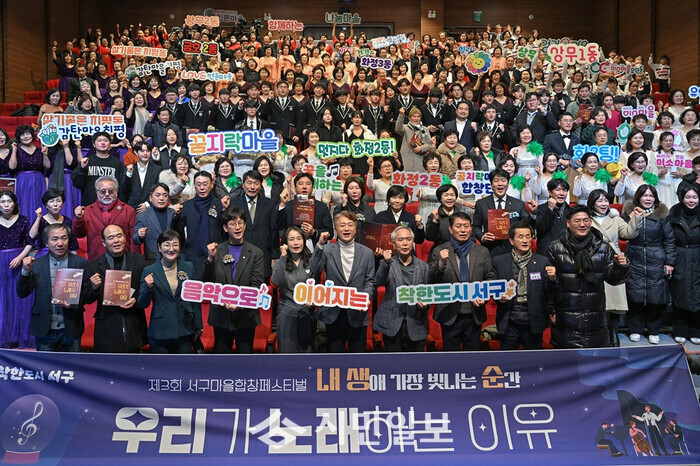 [광주=정찬남 기자] 광주광역시 서구는 24일 서빛마루문화예술회관에서 주부와 직장인, 자영업자 등 다양한 삶을 살아가는 주민들로 구성된 18개 동 마을합창단 단원 500여 명이 참석한 가운데 ‘내 생애 가장 빛나는 순간, 우리가 노래하는 이유’ 주제로 ‘제3회 서구 마을합창 페스티벌’을 개최했다./ 광주 서구 제공