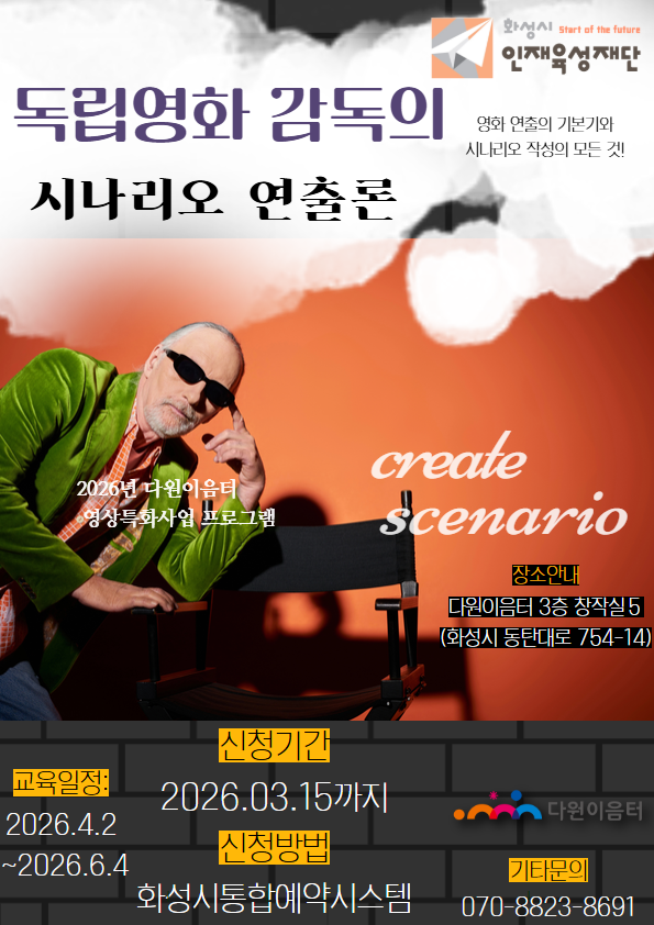 [화성=송윤근 기자] 경기 화성시인재육성재단(대표이사 임선일) 다원이음터는 오는 4월 2일(목)부터 6월 4일(목)까지 두 달간 관내 예비 창작자와 영화에 관심 있는 시민을 대상으로 한 미디어 특화 프로그램 「독립영화 감독의 시나리오 연출론」을 운영한다고 밝혔다.