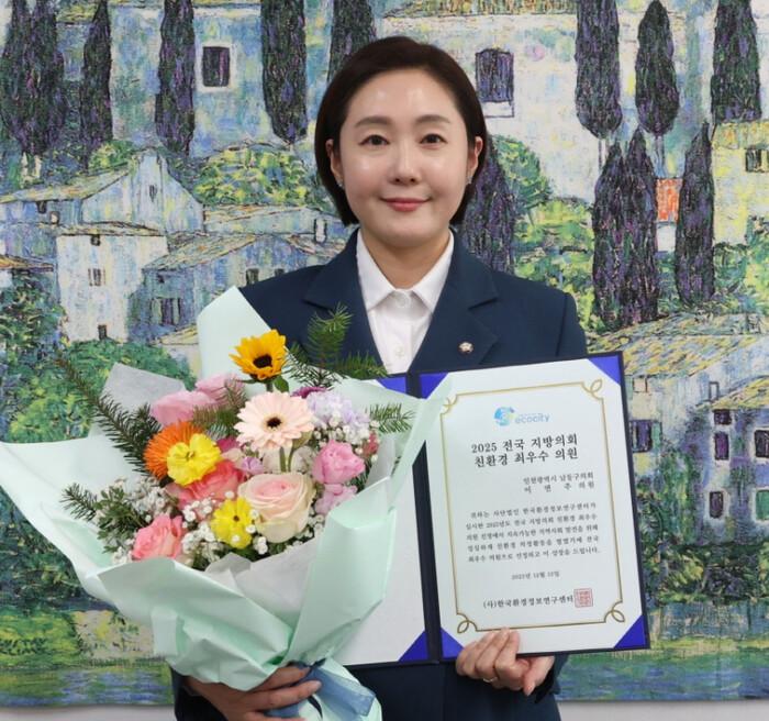 | ‘2025 전국 지방의회 친환경 최우수의원’으로 선정된 이연주 의원이 포즈를 취하고 있다. [사진=남동구의회] |