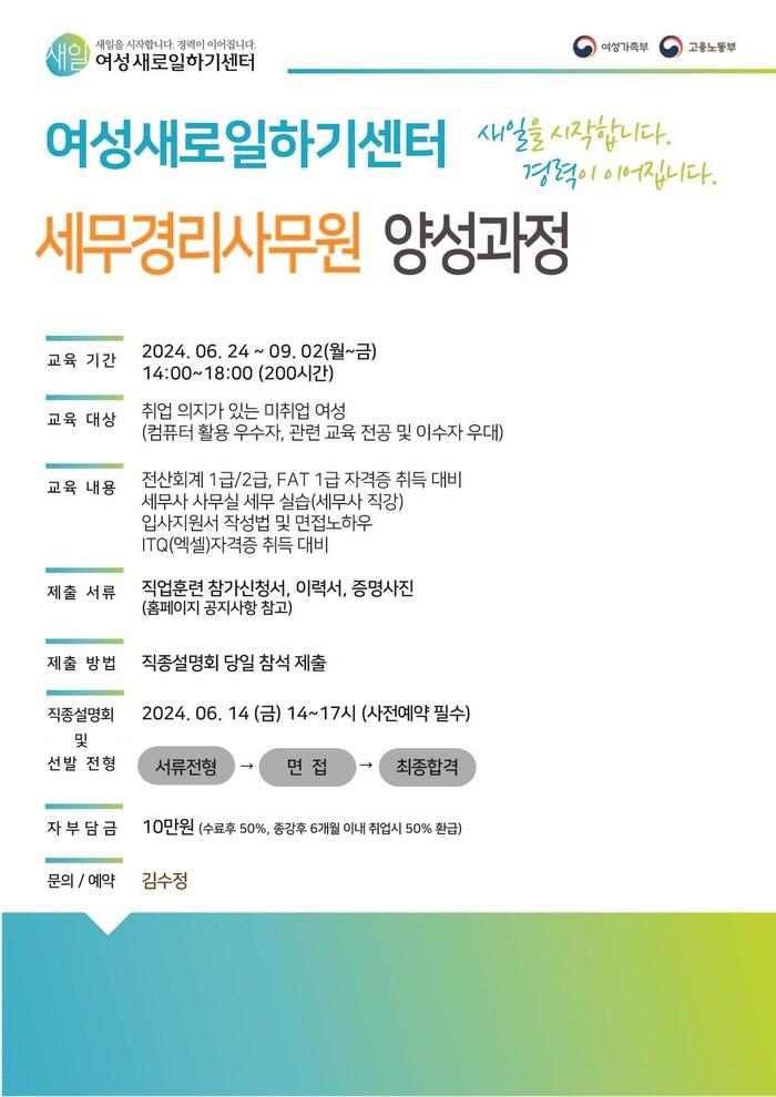 송파여성새로일하기센터는 미취업 여성을 위한 2024 직업훈련 “세무경리사무원 양성과정” 교육생을 모집한다고 밝혔다.
