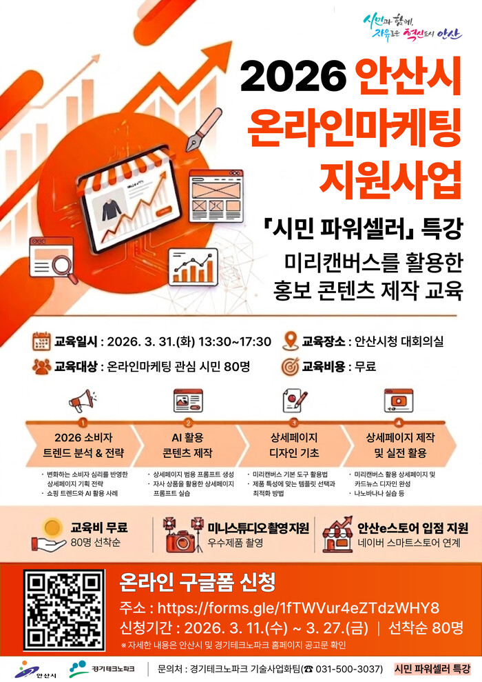 안산시가 주최하고 (재)경기테크노파크가 주관하는 이번 교육은 e비즈니스에 관심이 많은 청년 창업자와 예비 창업자, 시민 등을 대상으로 온라인 마케팅 실무역량을 높이기 위해 마련됐다.