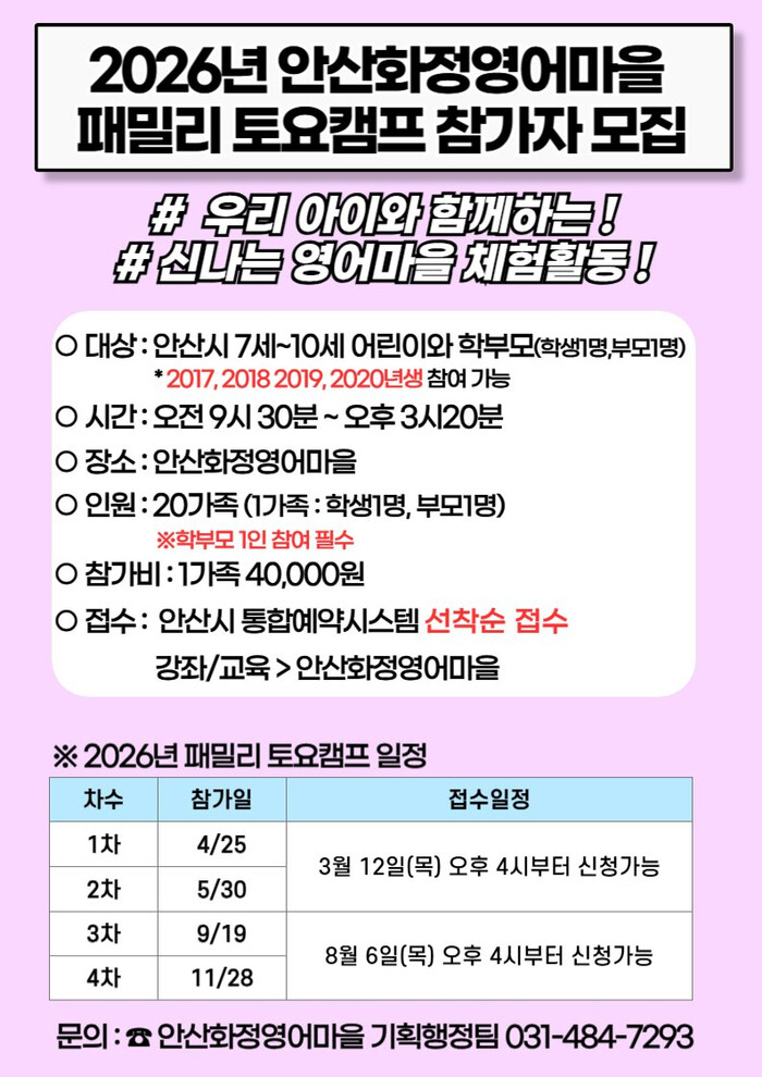 자세한 사항은 안산화정영어마을 기획행정팀으로 문의하면 안내받을 수 있고, 안산화정영어마을 누리집에서도 확인할 수 있다.