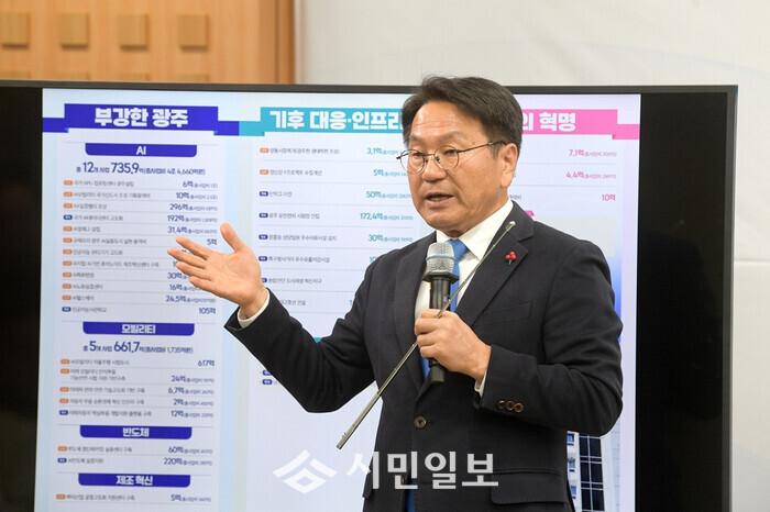 | ▲ 강기정 광주광역시장이 지난 3일 오후 시청 비즈니스룸에서 2026년 국비예산 관련 기자회견을 하고 있다. /광주광역시 제공 |