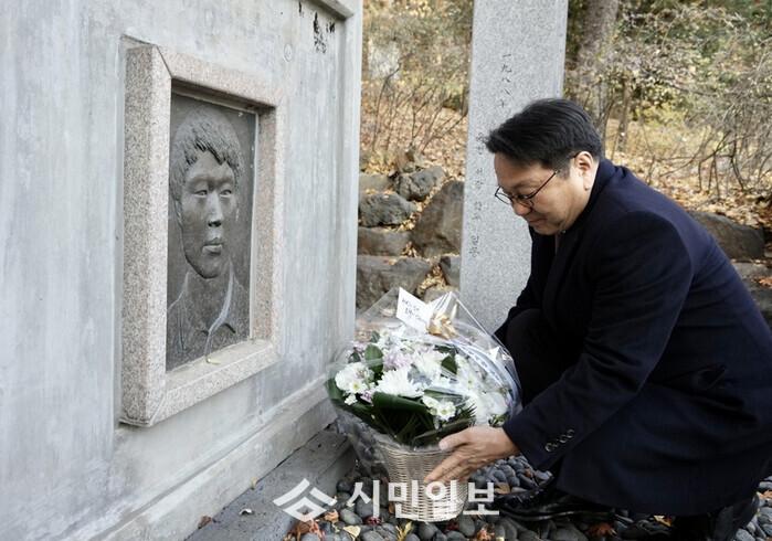 | ▲ 강기정 광주광역시장이 2일 오후 '오월광주와 민주주의' 특별강연에 앞서 서강대학교 로욜라 동산에서 김의기 열사 추모비에 참배하고 있다. /광주광역시 제공 |