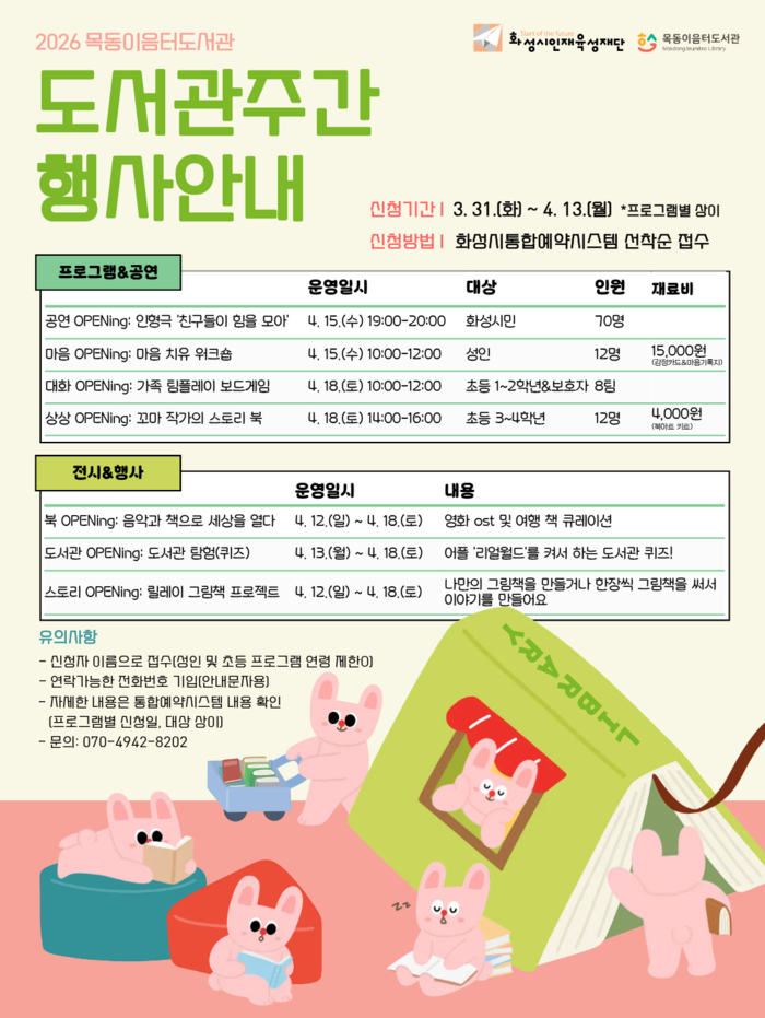 프로그램 참여 신청은 3월 31일(화)부터 화성특례시 통합예약시스템을 통해 가능하며, 프로그램별 일정에 따라 순차적으로 접수할 수 있다. 자세한 사항은 화성시립동탄목동이음터도서관 홈페이지 또는 화성특례시 통합예약시스템에서 확인할 수 있다.