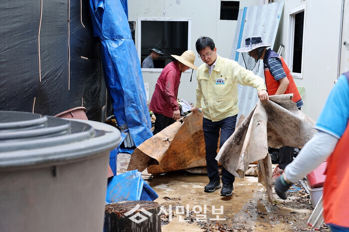 | ▲ 박병규 광산구청장이 지난해 7월 호우 피해 복구 현장을 찾아 일손을 보태고 있다. / 광주광역시 광산구 제공 |