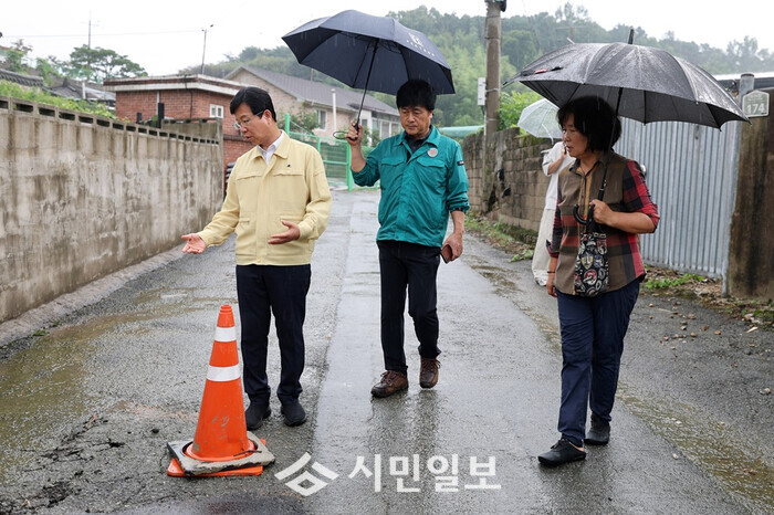 | ▲ 박병규 광산구청장이 지난해 8월 폭우로 피해가 발생한 임곡동 한 마을을 찾아 현장을 살피고 있다. / 광주광역시 광산구 제공 |