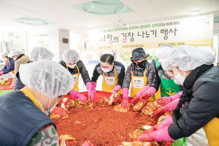 서울 강동구 고덕1동은 ‘온(溫)동네 나눔사업’의 일환으로 ‘사랑의 김장나눔 행사’를 열어 직능단체 회원들이 만든 김치 500kg와 농협하나로마트 고덕점에서 기부한 김치 500kg 등 총 1000kg 분량의 김치를 저소득 200가구에 전달했다. 사진은 이날 이정훈 구청장(가운데)과 봉사자들이 김장을 하는 모습.(사진제공=강동구청)