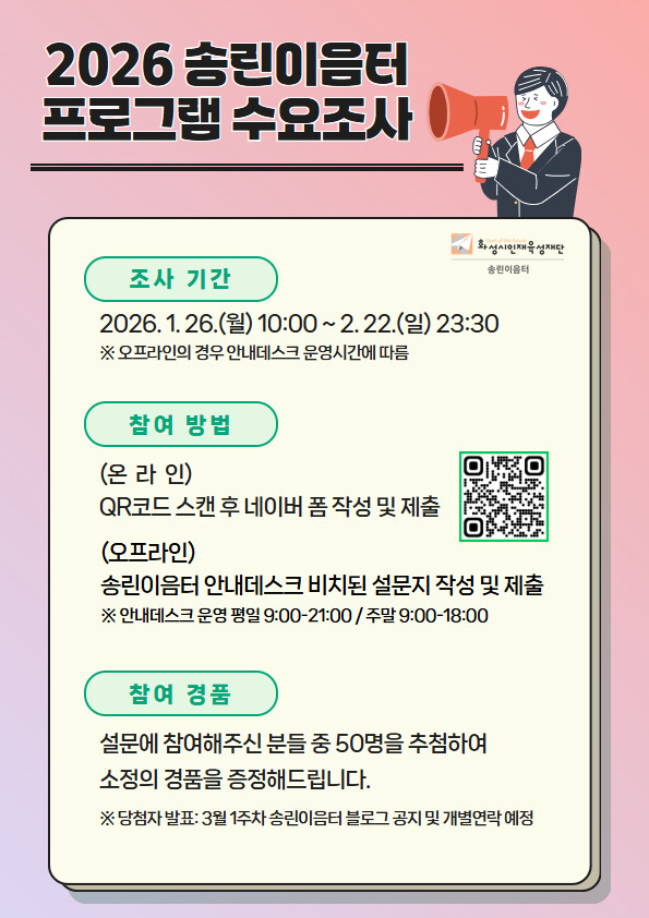 임선일 화성시인재육성재단 대표이사는 “이번 수요조사는 시민의 목소리를 직접 반영해 송린이음터 프로그램의 방향성을 설정하는 중요한 과정”이라며, “시민 여러분의 소중한 의견이 반영되어 지역과 함께 성장하는 송린이음터로 나아가길 기대한다”고 말했다.