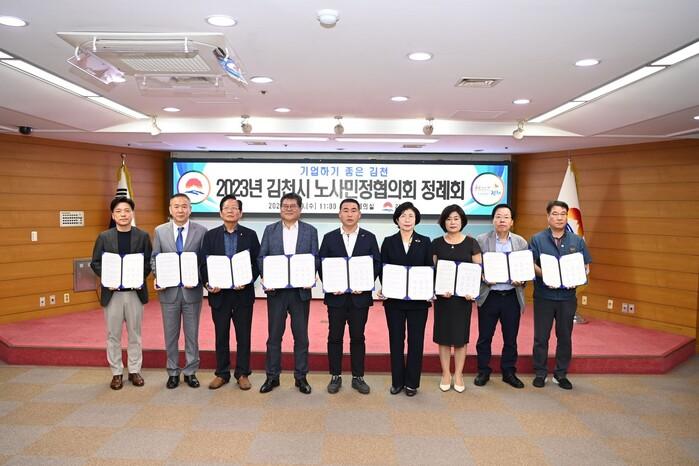 [김천=박병상 기자] 경북 김천시 노사민정협의회(위원장 김충섭 김천시장)는 지난 30일(화) 시청 2층 회의실에서 2023년 정례회를 개최하고, 「김천시 노동시장 이중구조 개선과 안전일터 조성을 위한 공동선언문」을 채택했다.