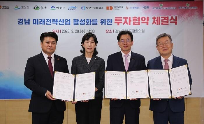 이날 협약식은 ㈜앨앤에프-하동군, HSR㈜-함안군의 투자협약도 함께 진행됐으며, 김병규 경제부지사를 비롯해 김정수 삼양식품㈜ 대표이사, 박일호 밀양시장, 하승철 하동군수, 송상락 광양만권경제자유구역청장 등 투자기업과 관계자 등이 참석했다.