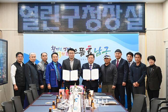 | ▲ 김병내 광주광역시 남구청장(왼 쪽부터 여섯 번째)이 구청장실에서 천원택시 돌봄택시 협약식을 가진 후 관계자 등과 기념촬영을 하고 있다. / 남구청 제공 |