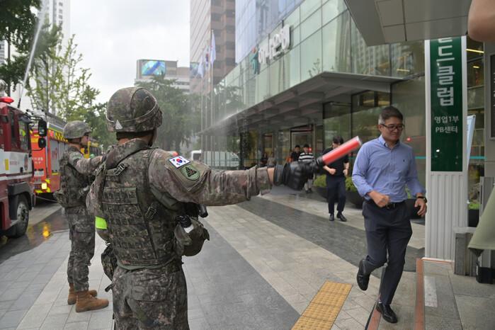 우선 테러범이 건물에 인화물질을 설치했다는 상황을 가정해 화재 대응 훈련을 진행했다. 훈련은 방화범 체포, 화재 발생 전파 및 신고, 화재 대피, 화재진압 및 구조 순으로 실시됐다.