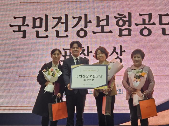 | ▲ 더해봄노인복지센터 김지애 사회복지사가 국민건강보험공단 본부장 표창장을 수여하고 있다. |
