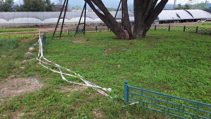 특히 반송이 낙뢰에 줄기가 갈라져 보수 공사한 이후 울타리는 인근 논에 버려져 있고 출입금지로 쓰이는 비닐은 바닥에 엉켜버려 천연기념물 관리의 부실함을 여실히 보여주고 있다.