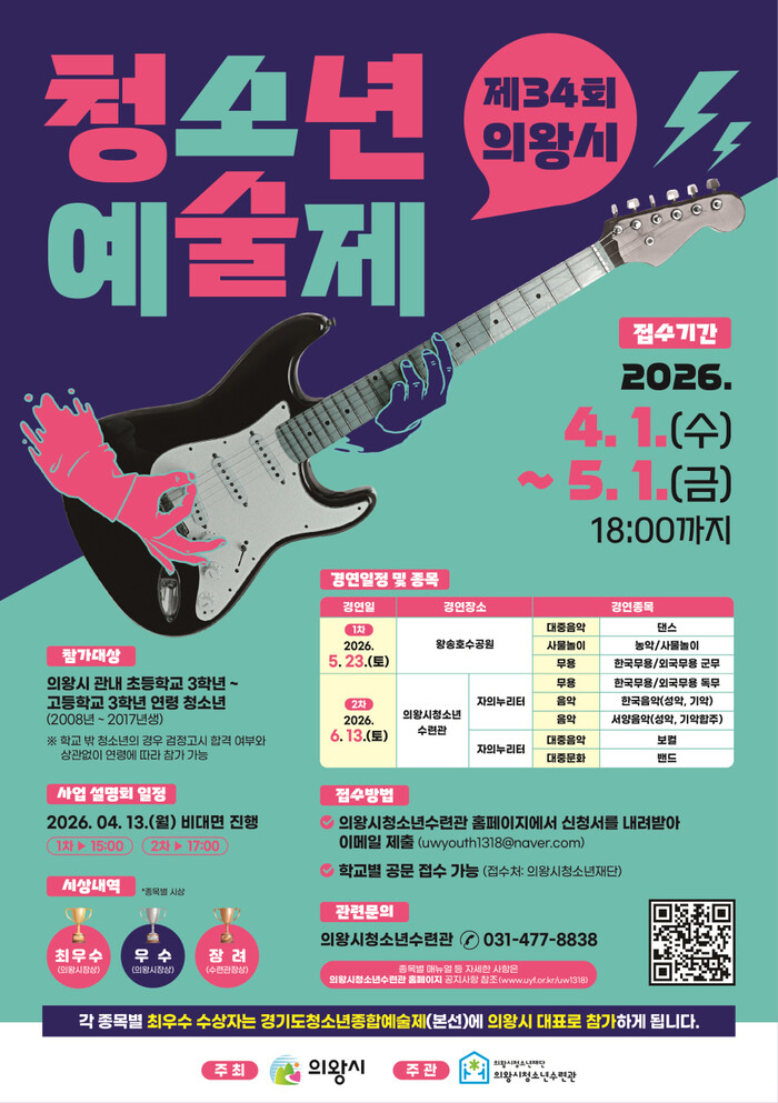 장원호 의왕시청소년예술제 담당자는 “청소년들이 주도적으로 참여하는 예술 활동을 통해 자신의 재능을 마음껏 펼칠 수 있는 기회가 되길 바란다”며 “관내 청소년들의 많은 관심과 참여를 기대한다”고 전했다.