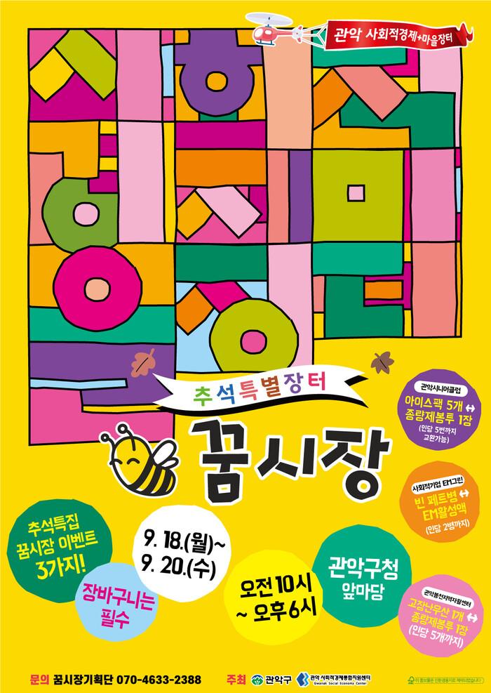 [시민일보 = 여영준 기자] 서울 관악구(구청장 박준희)는 추석을 맞아 구청 광장에서 18~20일 대표적 사회적경제장터인 ‘꿈시장’을 연다고 17일 밝혔다.