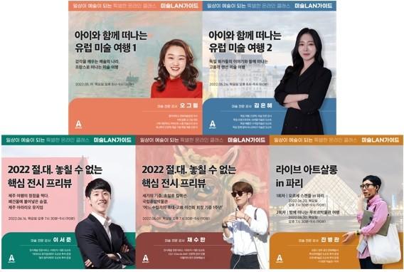 △아이와 함께하는 유럽 미술여행-프랑스(강사 오그림) △아이와 함께 떠나는 유럽 랜선 미술여행-독일(강사 김은혜) △핵심 전시 프리뷰-국립중앙박물관 '어느 수집가의 초대'(강사 채수한) △핵심 전시 프리뷰-제주여행의 정점, 아라리오 갤러리(강사 이서준) △라이브 아트살롱 IN 파리(2회)-오르세미술관/루브르박물관(강사 진병관) 등 총 6가지로 구성된 해당 강의는 ZOOM 화상회의를 통해 진행된다.