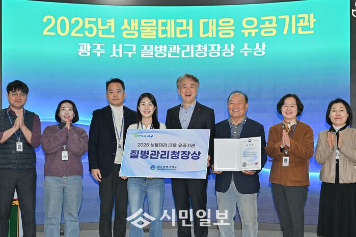 | ▲김이강 광주광역시 서구청장(사진 가운데)이 질병관리청 주관, '2025 생물테러 대응' 전국지자체 발굴 공모에서 서구청이 우수기관에 선정돼 질병관리청장상을 수상한 보건소 관계자 등과 기념촬영을 하고 있다./ 광주광역시 서구청 제공 |